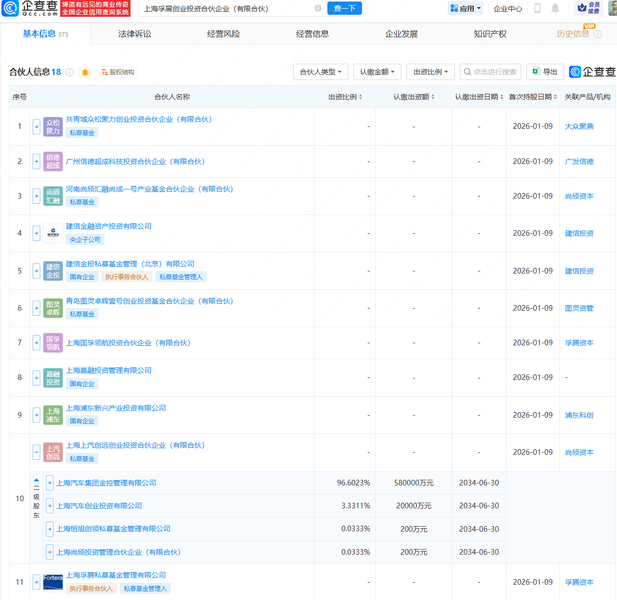 近日,上海孚展创业投资合伙企业(有限合伙)成立,出资额27.5亿元宏益配资,经营范围包含:创业投资。企查查股权穿透显示,该合伙企业由建信金融资产投资有限公司、上汽集团旗下上海上汽创远创业投资合伙企业(有限合伙)等共同持股。