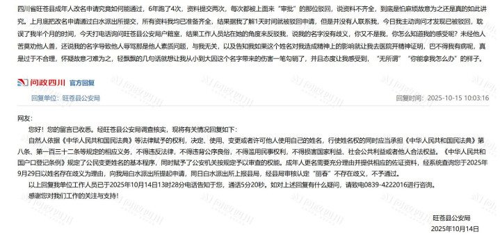 10月15日,旺苍县公安局回复该网友称,自然人依据《中华人民共和国民法典》等法律赋予的权利,决定、使用、变更或者许可他人使用自己的姓名,行使姓名权的同时应当承担《中华人民共和国民法典》第八条、第一百三十二条等规定的相应义务,不得违反法律,不得违背公序良俗,不得滥用民事权利,不得损害国家利益、社会公共利益或者他人合法权益。《中华人民共和国户口登记条例》规定了公民变更姓名的基本程序,同时赋予了公安机关按规定予以审查的权能。成年人更名需要充分理由并提供相应的佐证资料,经系统查询您于2025年9月29日以姓名存在歧义为理由,向我局白水派出所提起申请,同日白水派出所上报县局,经县局审核认定“丽春”不存在歧义,不予通过。